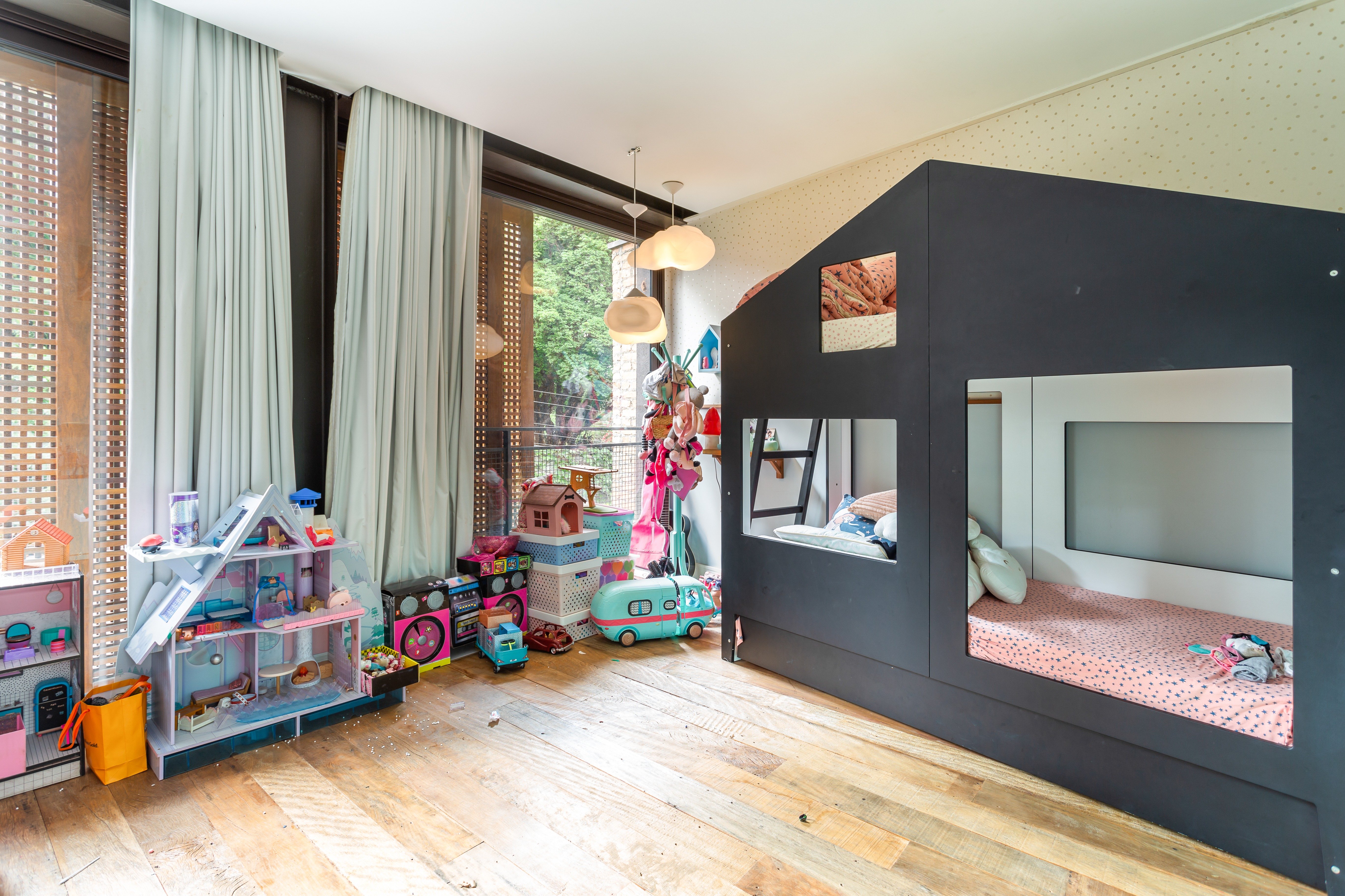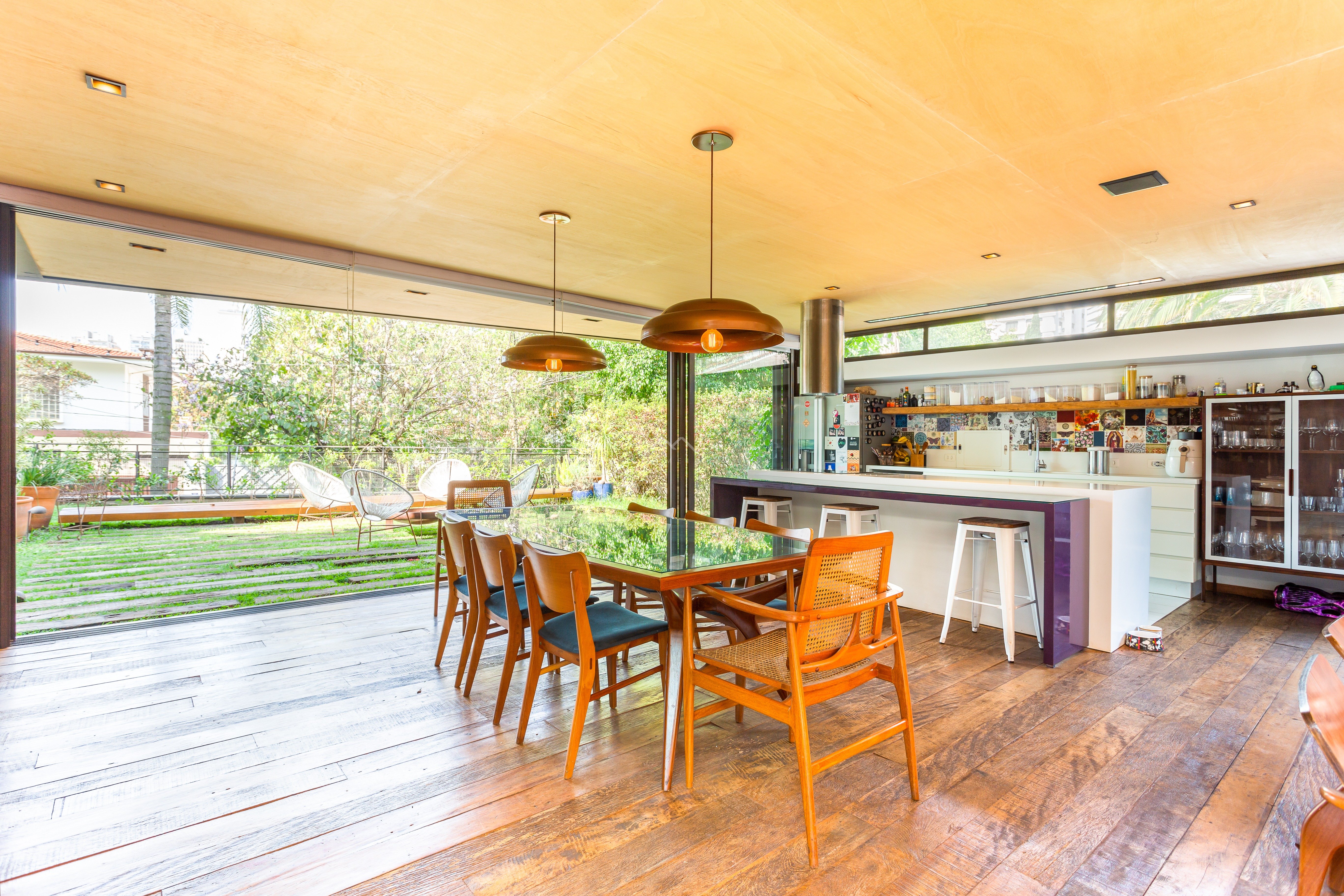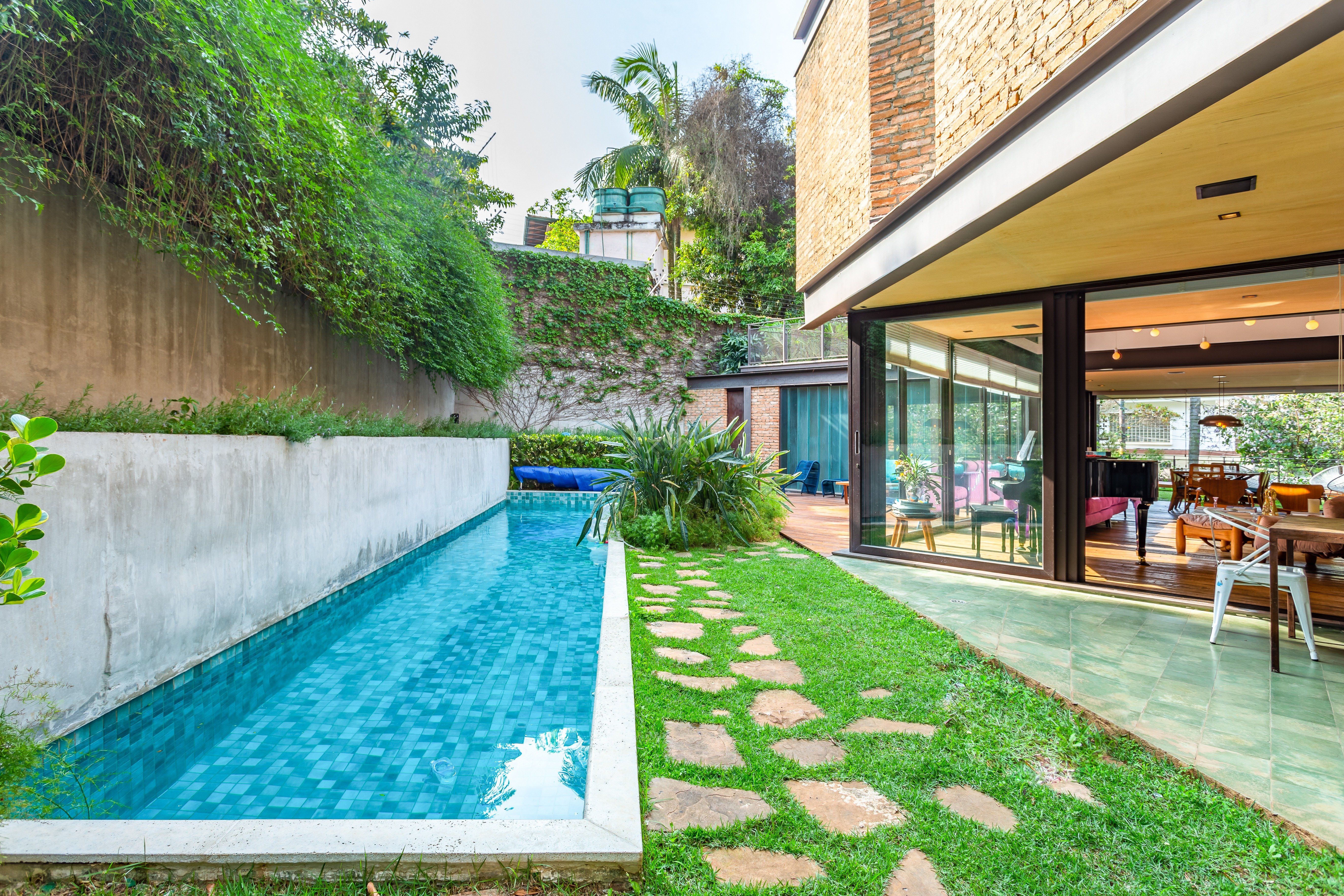 No térreo sala aberta para jardim na frente e fundo do imóvel muito integrado, inclusive cozinha aberta para a sala, Sala de tv , espaço gourmet voltado para piscina. suite principal no andar superior , suite americana ou dois quartos que dividem um banheiro. Na cobertura mais uma grande sala com banheiro completo, podendo ser um escritório ou uma quarta suite. Edícula no jardim com dois andares, sala de brinquedo e academia no andar superior. Garagem no nível da rua, quarto de funcionários e lavanderia.