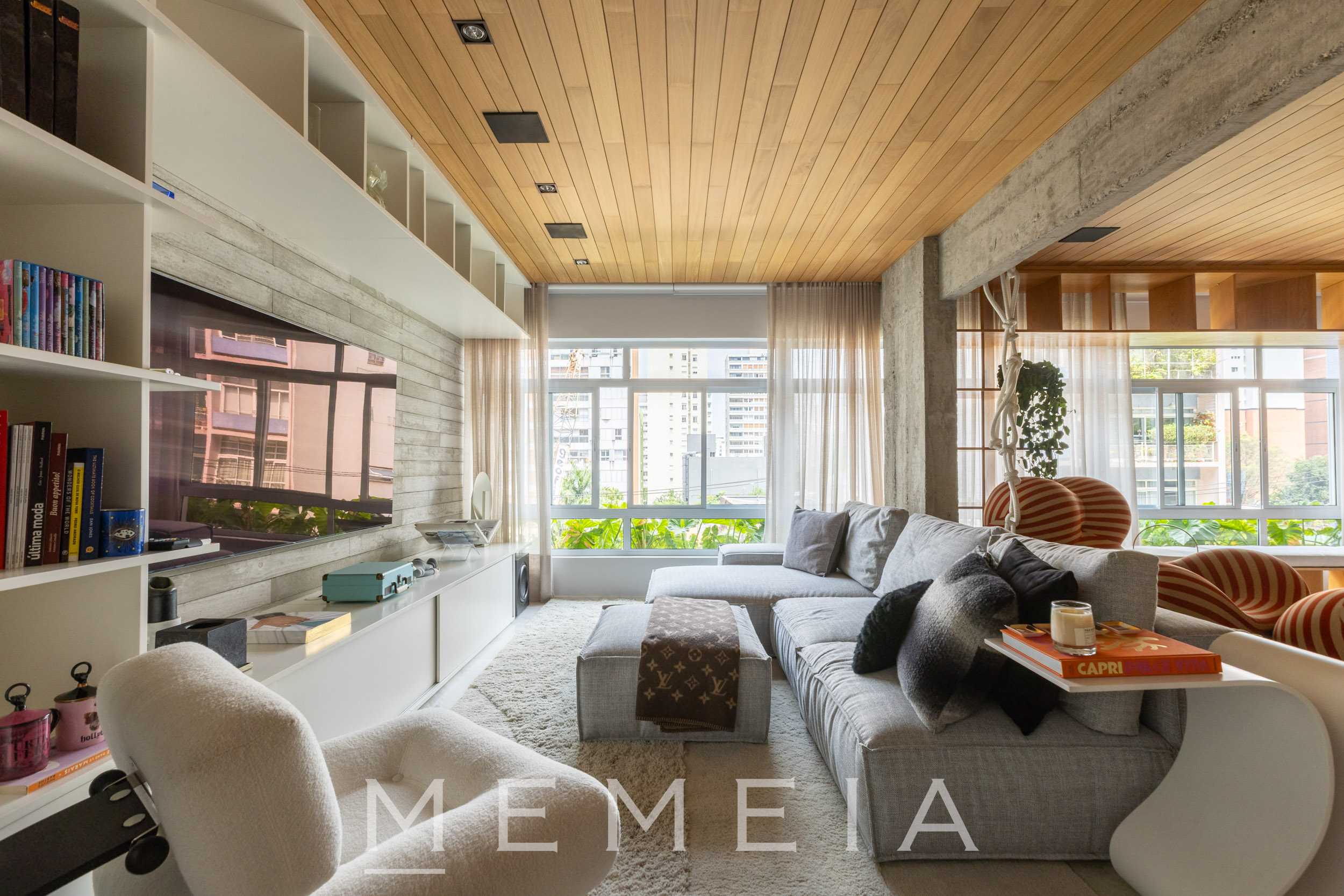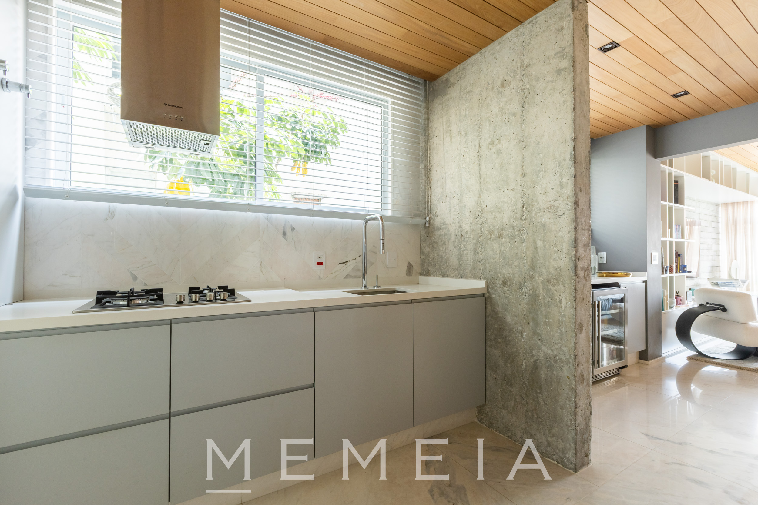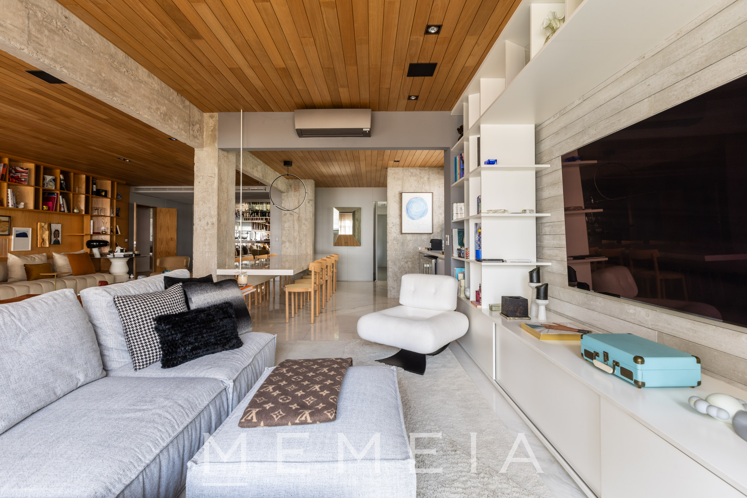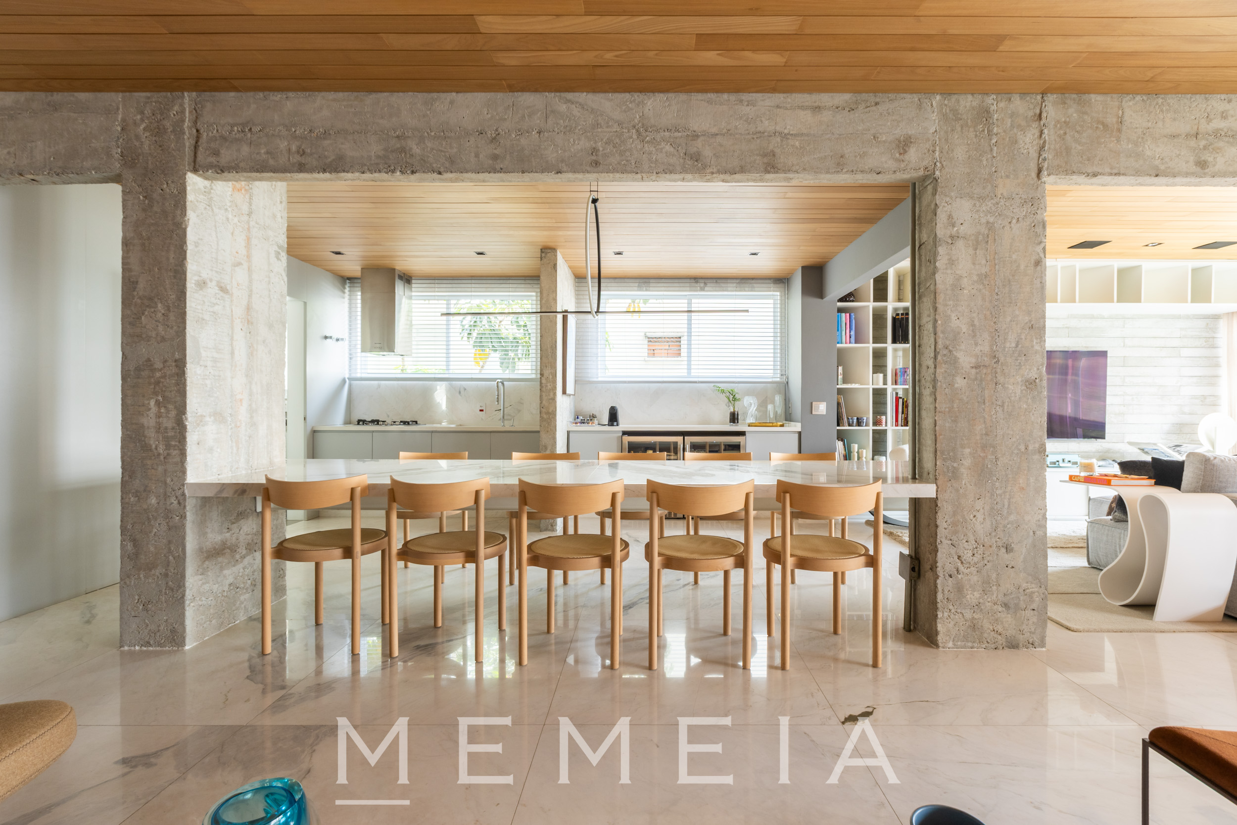 A área social se organiza em um grande espaço contínuo, onde estar, jantar e cozinha se conectam fluidamente. As amplas aberturas permitem que a luz percorra todo o ambiente, reforçando a sensação de profundidade e integração. O projeto explora uma paleta de materiais atemporais: madeira no teto e nos painéis, concreto aparente estruturando os volumes e pedra natural nos pisos e superfícies. A cozinha se integra naturalmente à área social, com bancada generosa e desenho funcional, mantendo a leitura limpa dos planos e das circulações. Na área íntima, os ambientes seguem a mesma lógica de serenidade e proporção, com espaços amplos, iluminação natural abundante e acabamentos que reforçam a atmosfera acolhedora do apartamento.