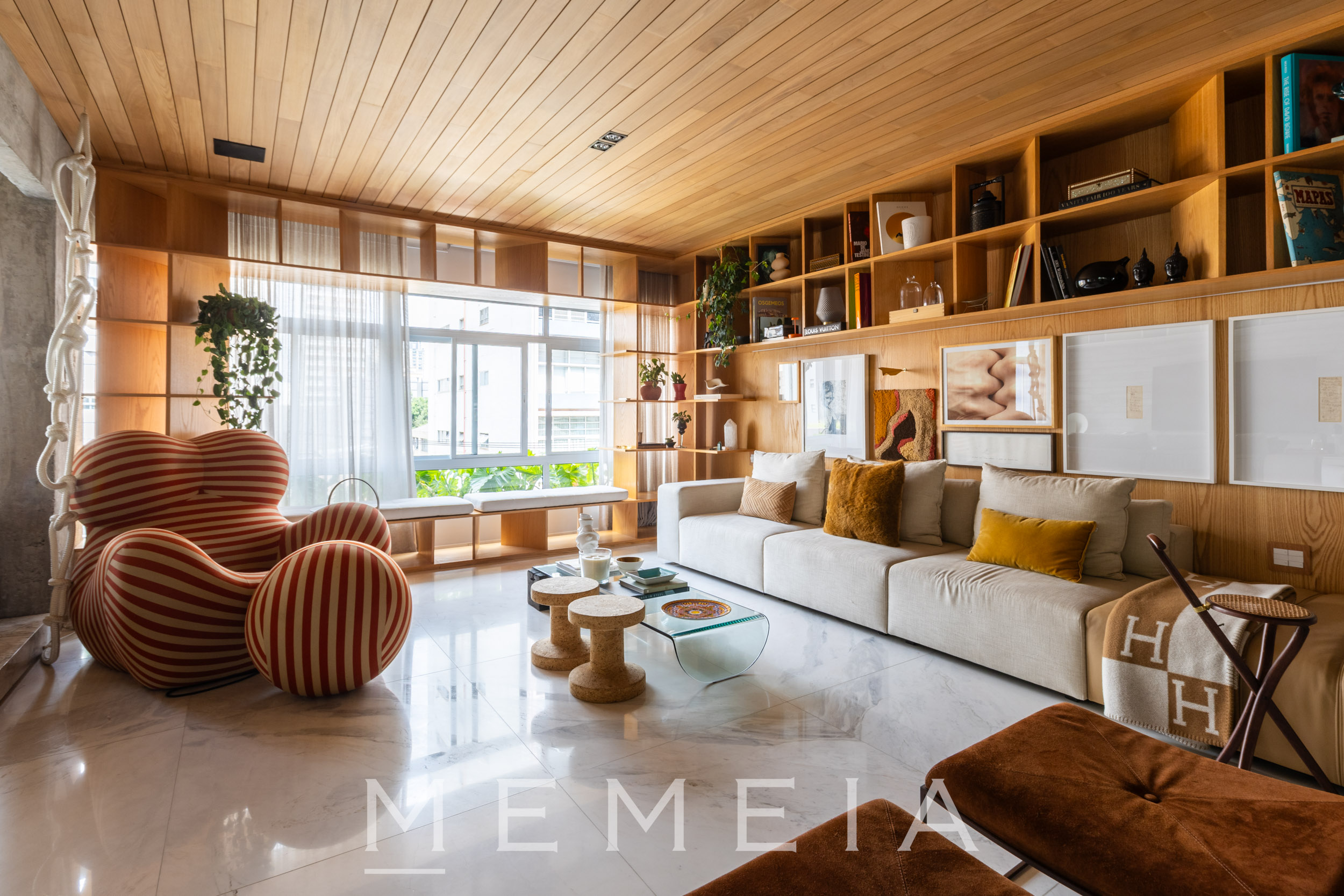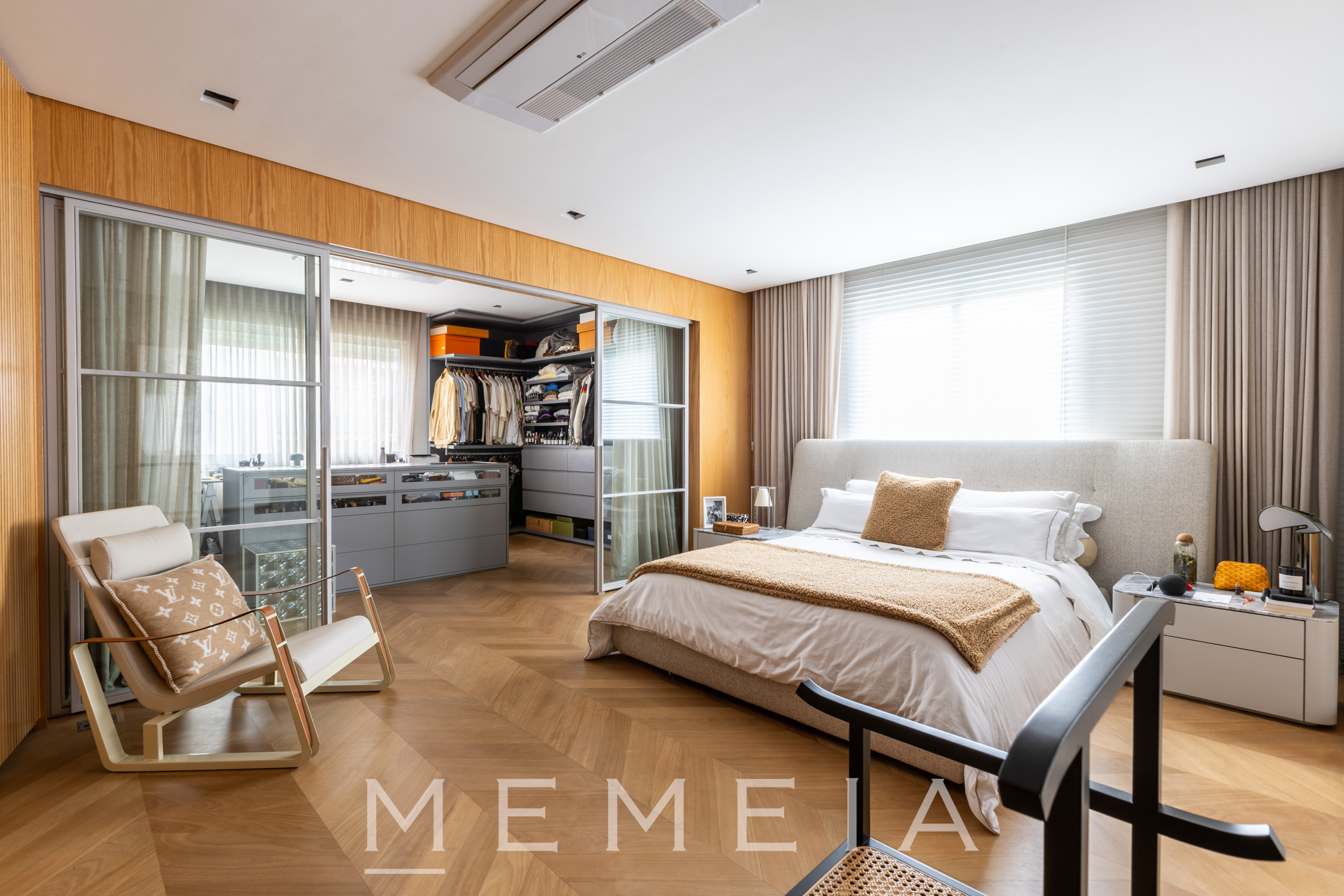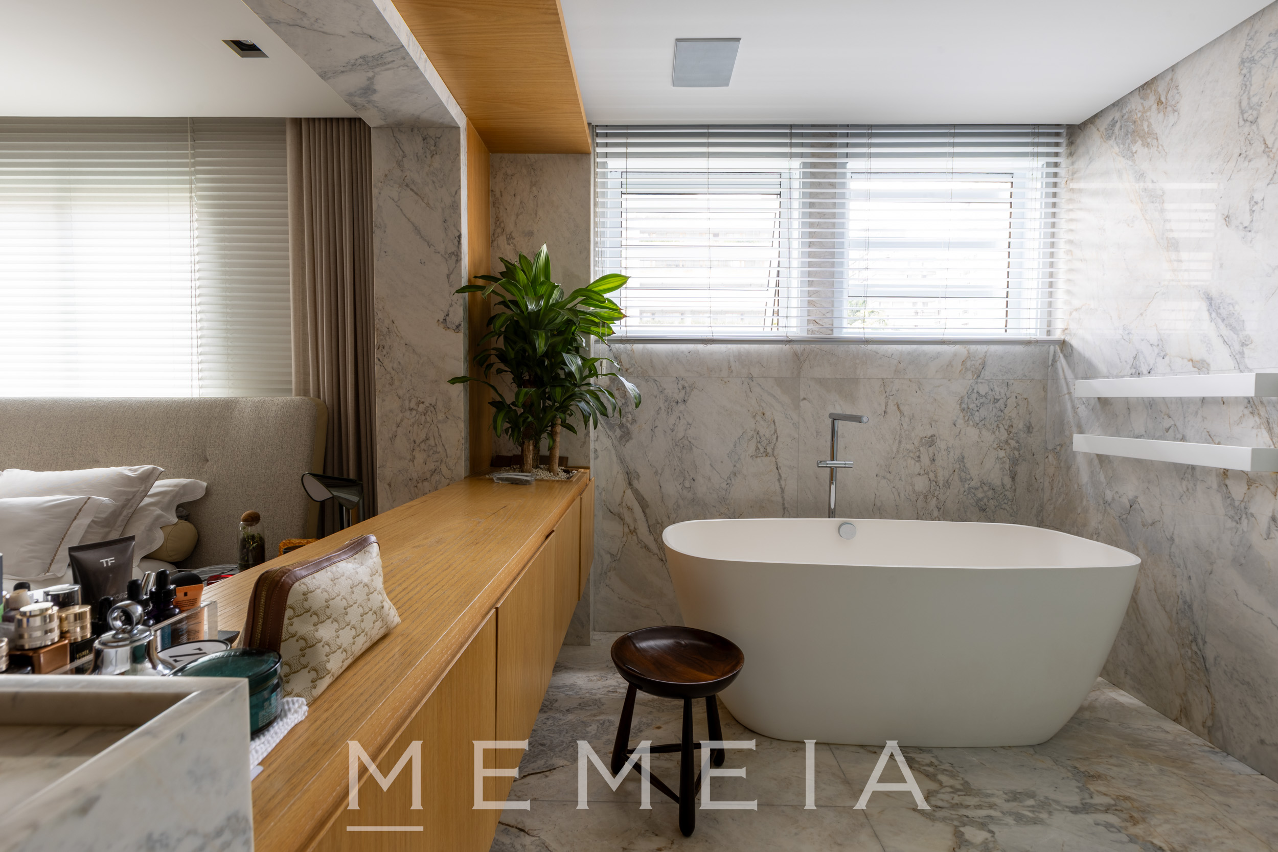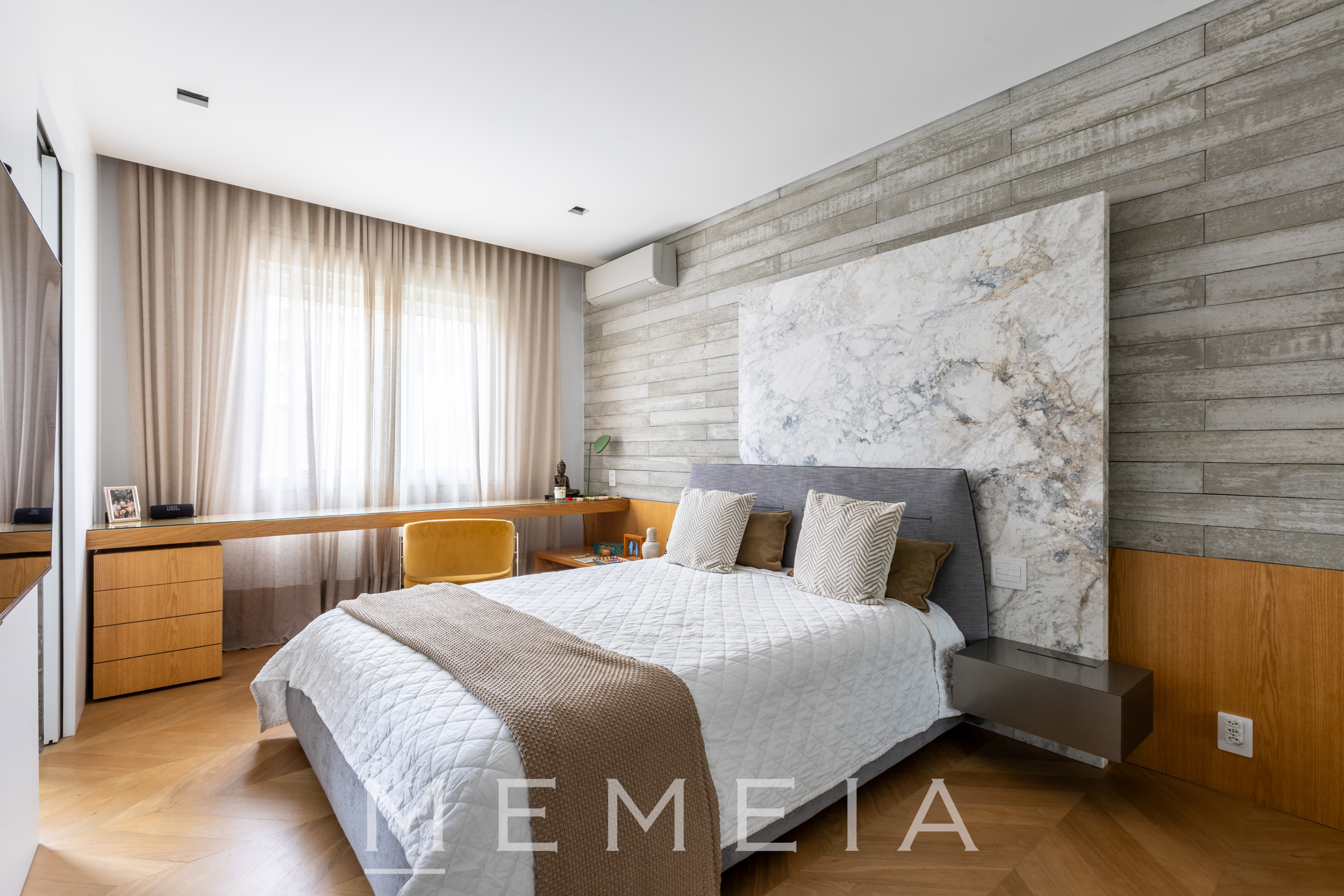 A área social se organiza em um grande espaço contínuo, onde estar, jantar e cozinha se conectam fluidamente. As amplas aberturas permitem que a luz percorra todo o ambiente, reforçando a sensação de profundidade e integração. O projeto explora uma paleta de materiais atemporais: madeira no teto e nos painéis, concreto aparente estruturando os volumes e pedra natural nos pisos e superfícies. A cozinha se integra naturalmente à área social, com bancada generosa e desenho funcional, mantendo a leitura limpa dos planos e das circulações. Na área íntima, os ambientes seguem a mesma lógica de serenidade e proporção, com espaços amplos, iluminação natural abundante e acabamentos que reforçam a atmosfera acolhedora do apartamento.