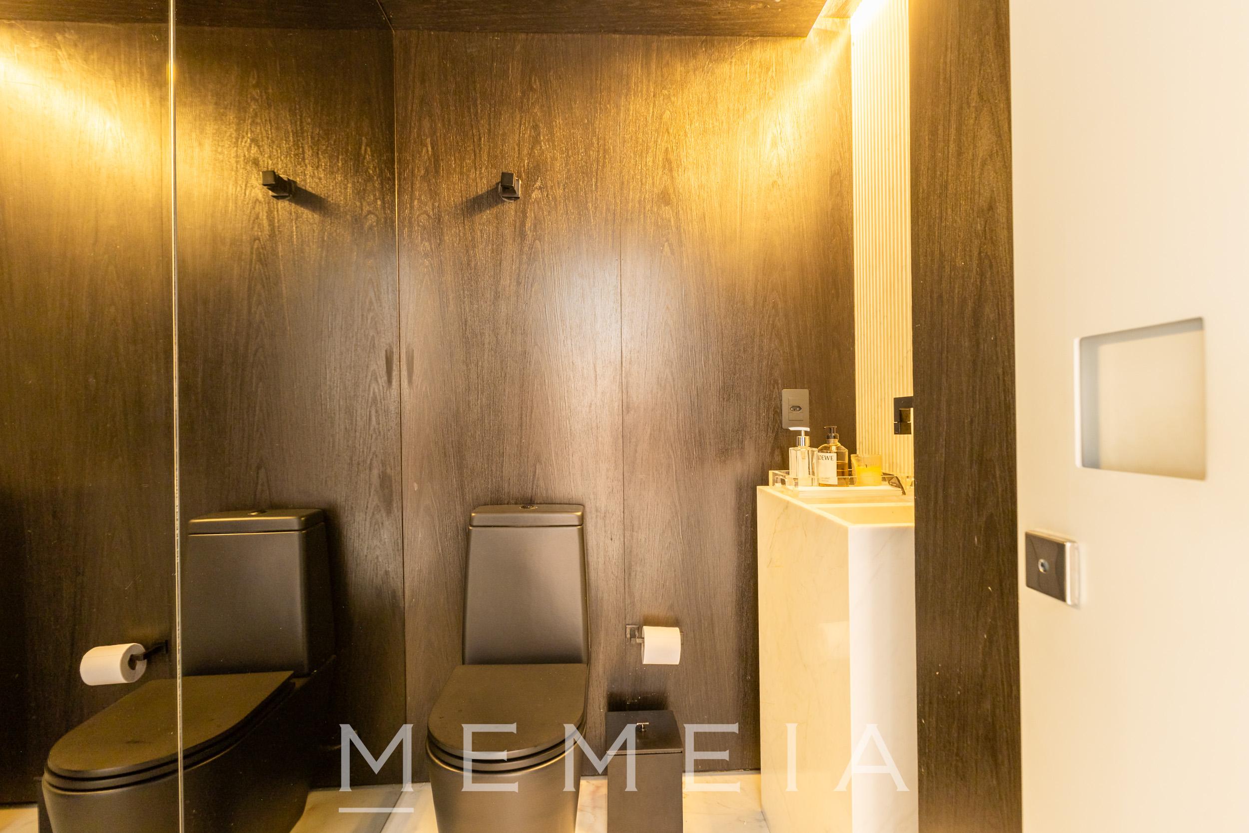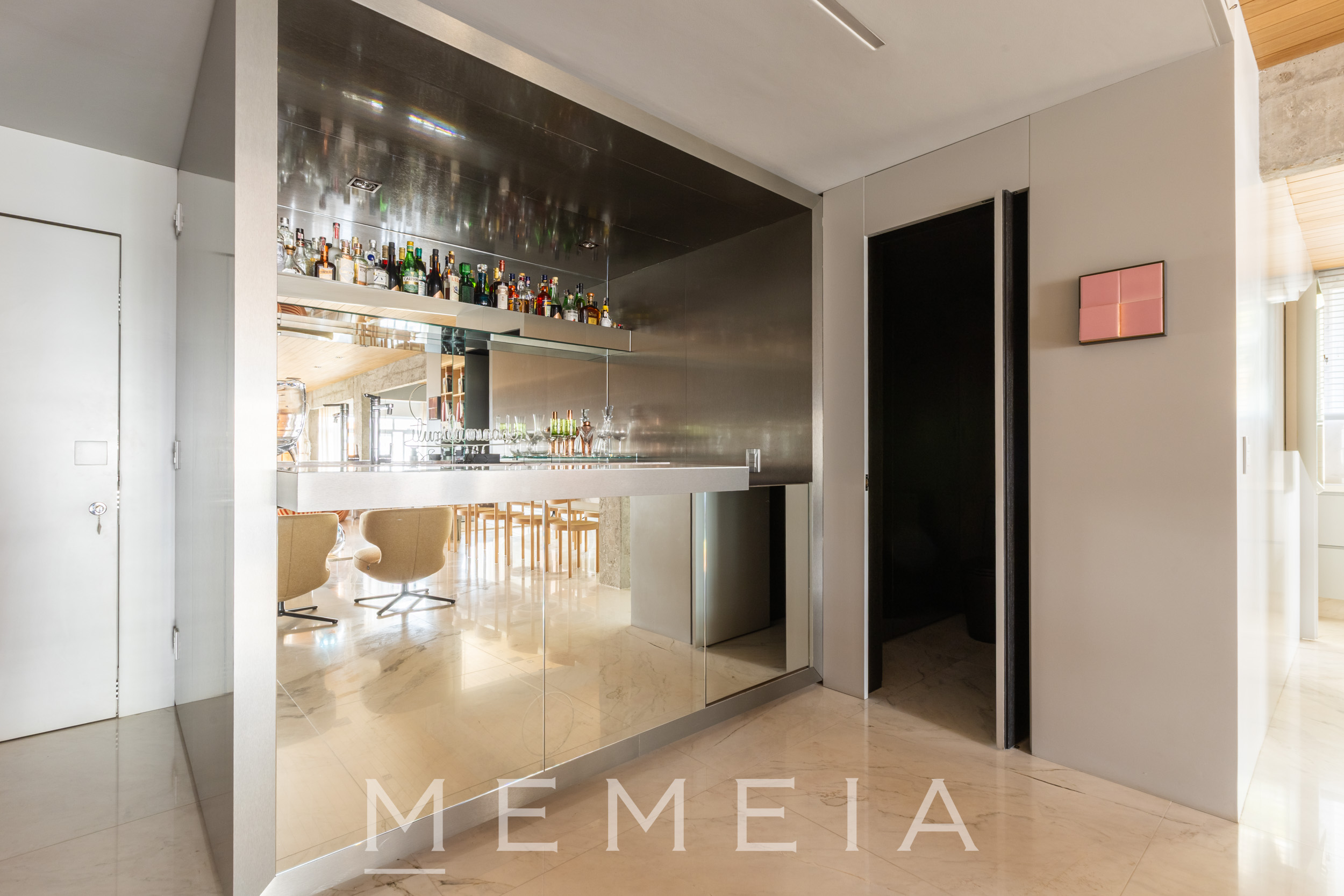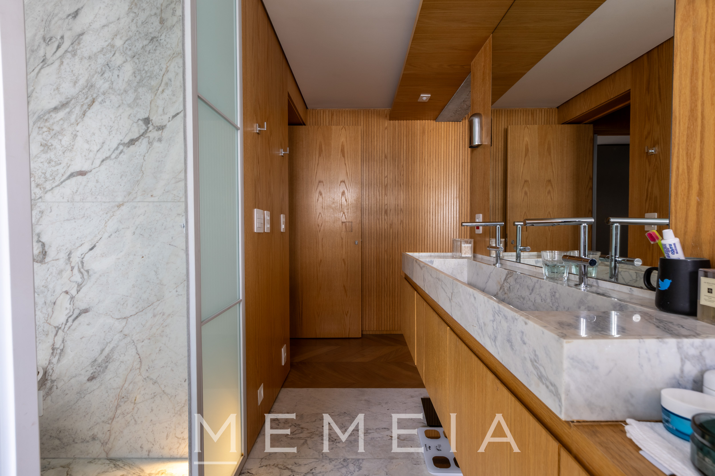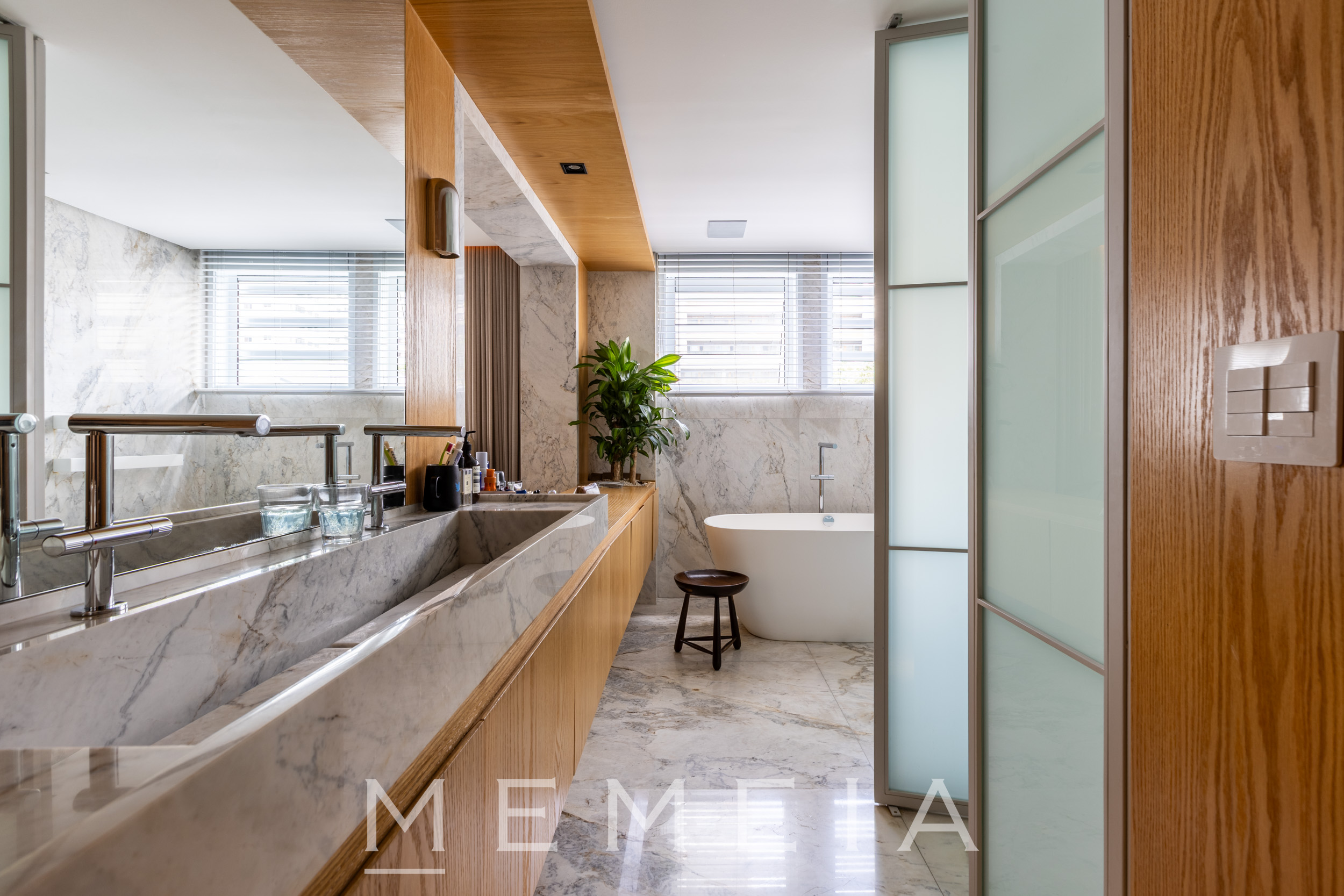 A área social se organiza em um grande espaço contínuo, onde estar, jantar e cozinha se conectam fluidamente. As amplas aberturas permitem que a luz percorra todo o ambiente, reforçando a sensação de profundidade e integração. O projeto explora uma paleta de materiais atemporais: madeira no teto e nos painéis, concreto aparente estruturando os volumes e pedra natural nos pisos e superfícies. A cozinha se integra naturalmente à área social, com bancada generosa e desenho funcional, mantendo a leitura limpa dos planos e das circulações. Na área íntima, os ambientes seguem a mesma lógica de serenidade e proporção, com espaços amplos, iluminação natural abundante e acabamentos que reforçam a atmosfera acolhedora do apartamento.