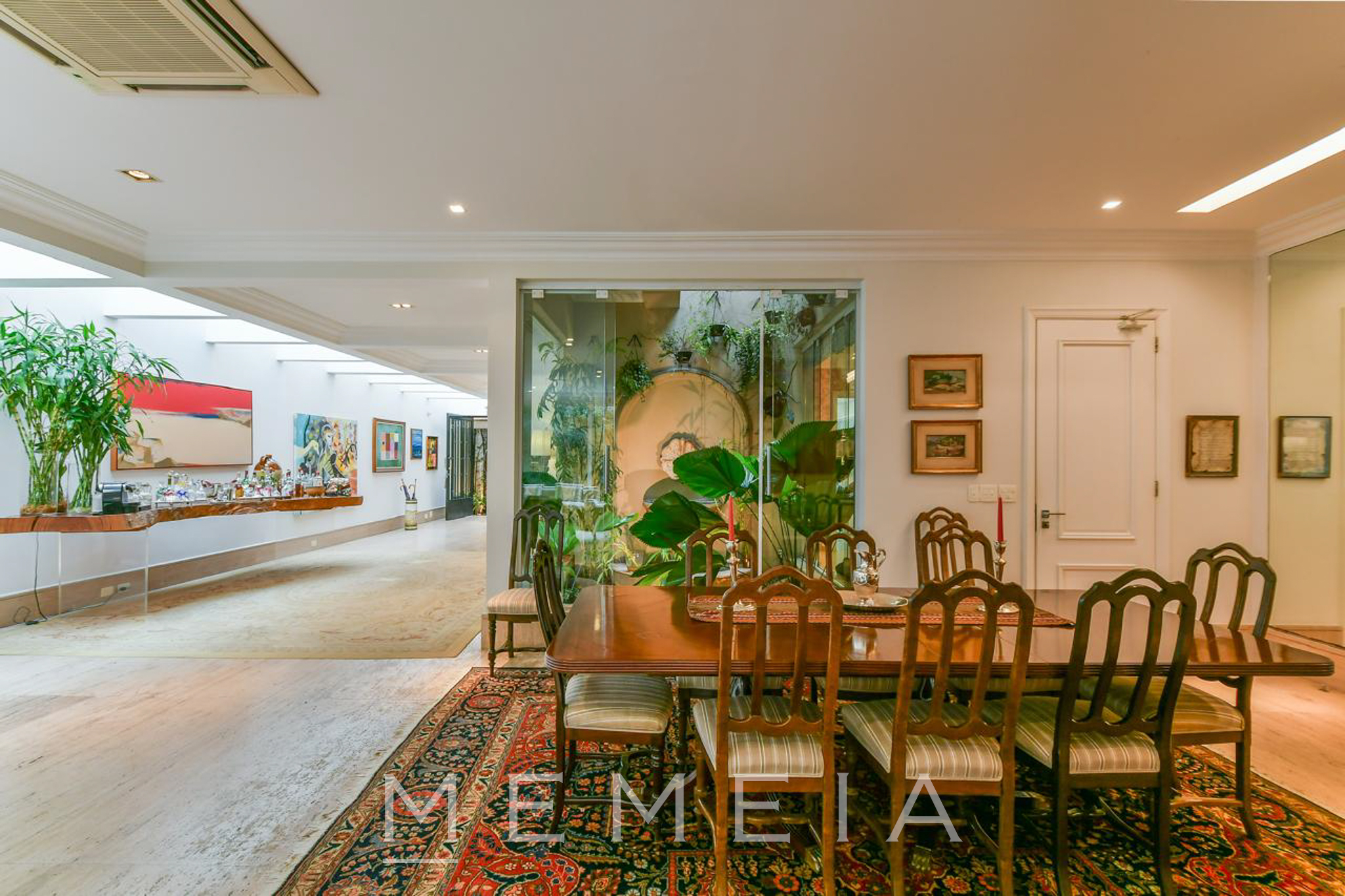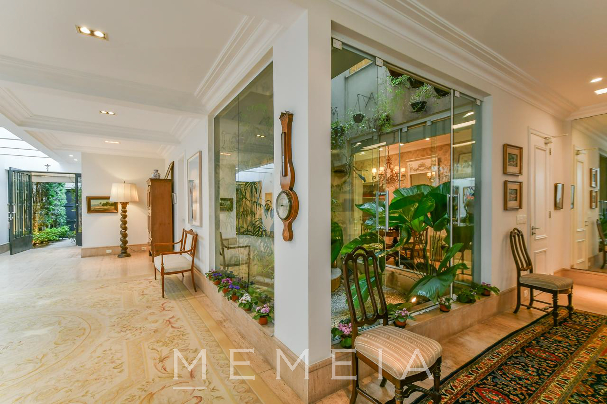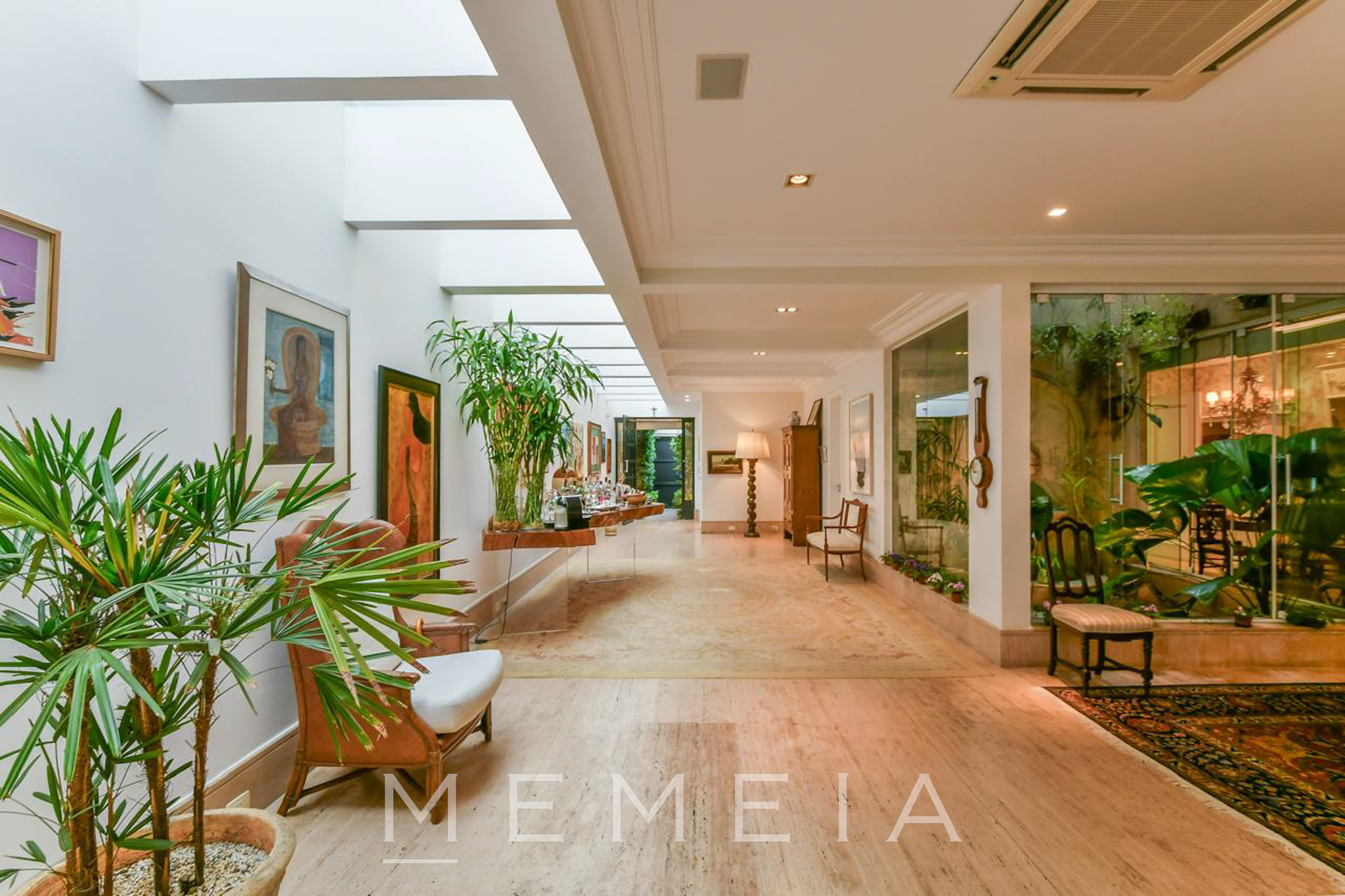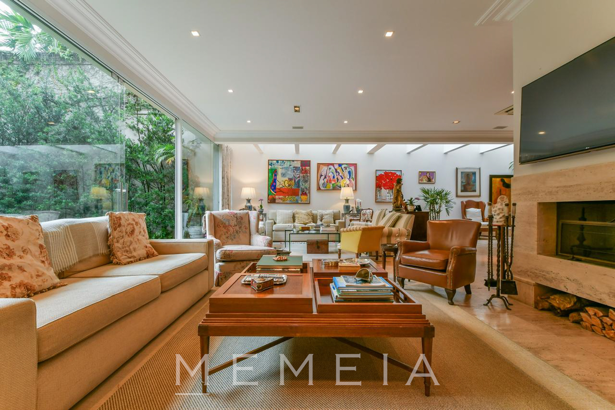 Possui 3 suítes espaçosas com varandas, ar condicionado e armários embutidos, sendo a master com closet, banheiro Sr. e Sra. e escritório. Living com lareira dupla integrado ao jardim e piscina, sala de jantar, cozinha conectada à copa e jardim de inverno com fonte. Piso em mármore travertino e taco de madeira. Conta com 2 vagas de garagem (com opção para 3) e subsolo com dependências de serviço. Pronta para mora.